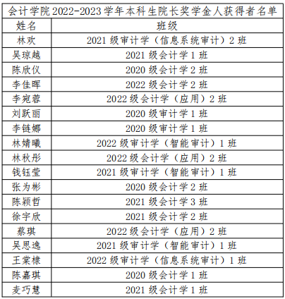 根据《广东财经大学本科学生奖学金评选办法》的奖励标准确定,我院2022-2023学年符合参评人数为1188人,院长奖学金名额为18名。经学生提交申请,学院组织答辩大会,申请的学生进行答辩,并经学院党政联席会议研究,现将成功当选的候选人最终成绩公布如下: