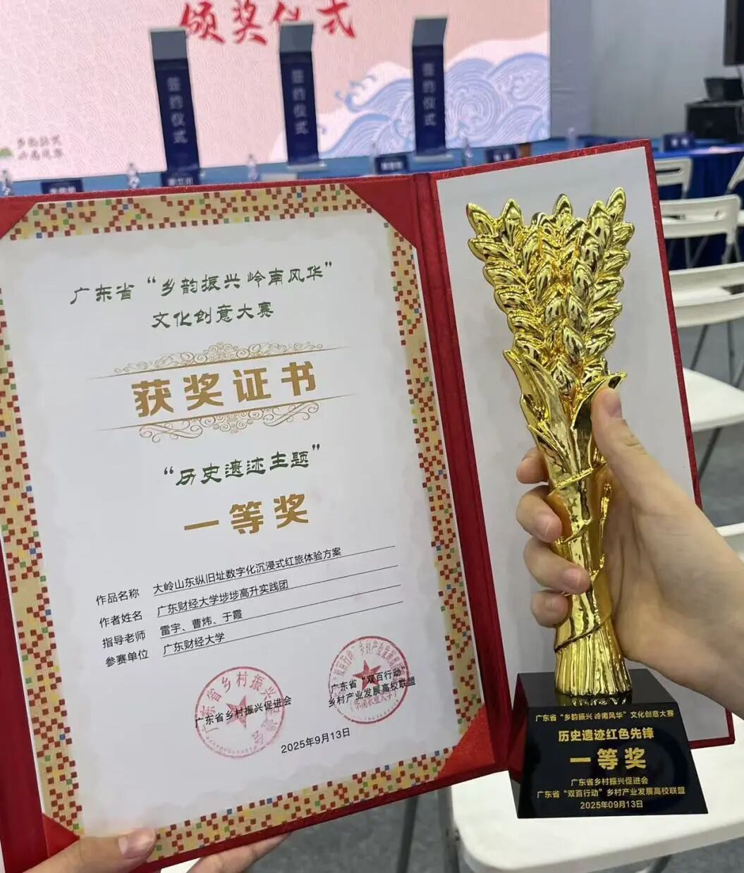 会计学院“埗埗高升”实践团在广东省“乡韵振兴 岭南风华”文化创意大赛中斩获佳绩,其参赛作品《大岭山东纵旧址数字化沉浸式红旅体验方案》荣获一等奖!
