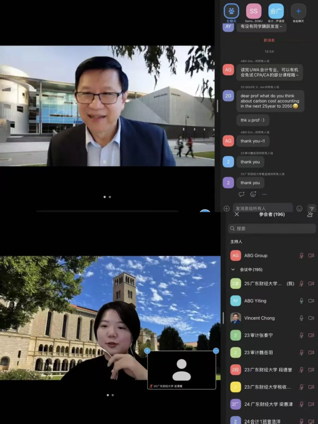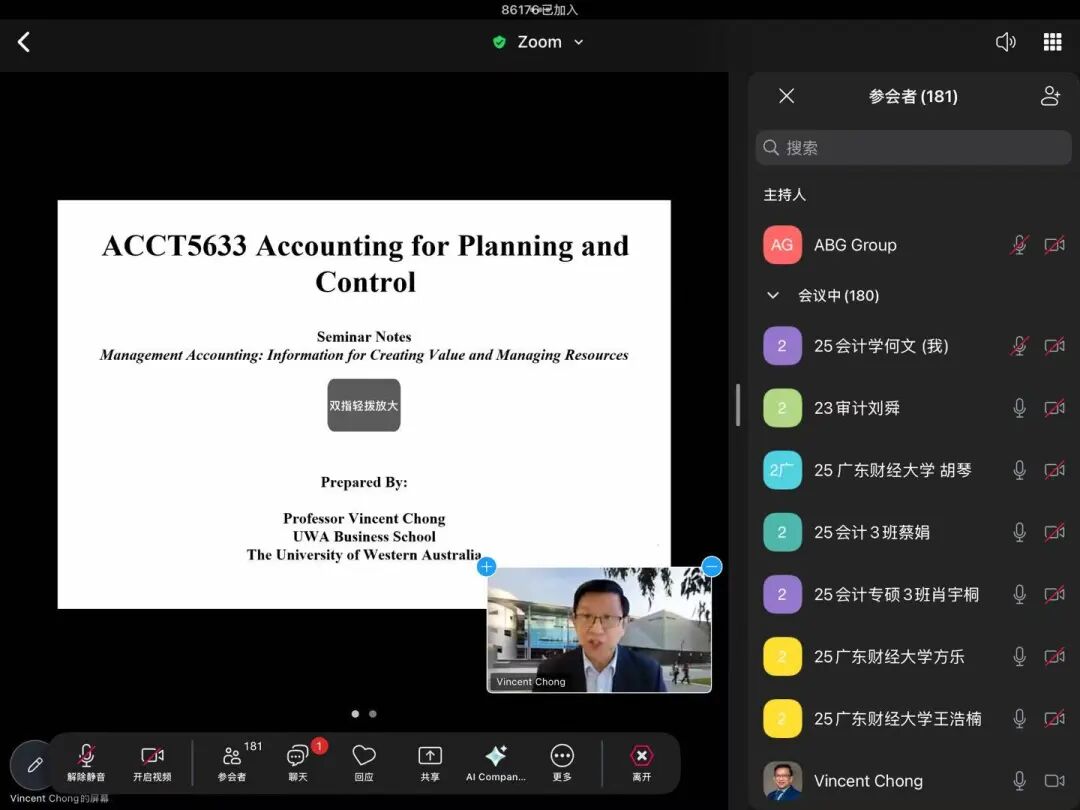 20251014日下午,会计学院邀请了来自西澳大商学院Vincent K. Chong教授作第8期教学慧享——管理会计的主题分享。本期教学慧享通过zoom会议平台圆满举行,由会计学院和粤港澳大湾区资本市场与审计治理研究院联合主办,主讲老师为西澳大学(University of Western Australia)商学院会计学Vincent K. Chong教授,由ABG Yiting老师主持,学院部分教师、会计学(中外联合培养项目班)、会计学(国际会计ACCA)专业本科生和部分研究生参与线上会议,参会人数超过200人。