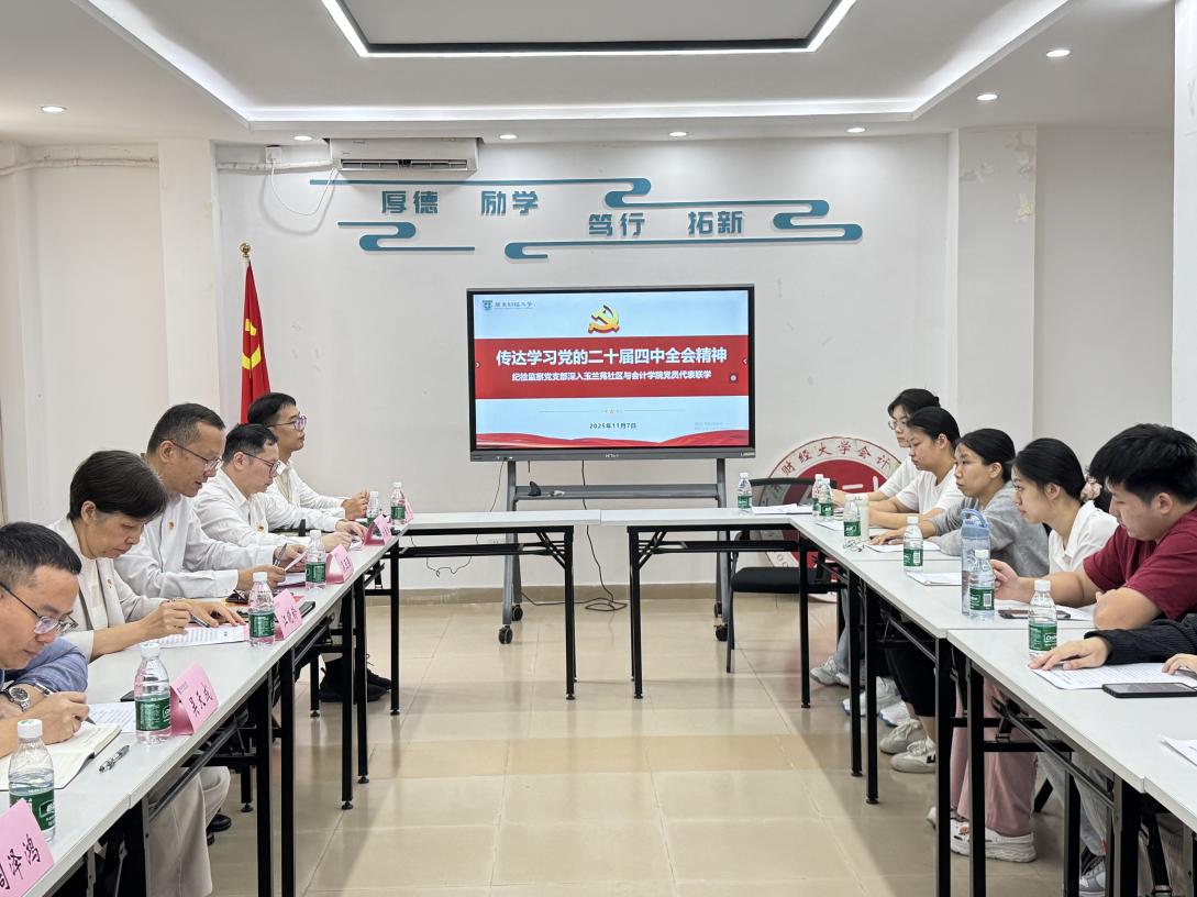 为深入学习贯彻党的二十届四中全会精神,切实把思想和行动统一到党中央决策和部署上来。11 月 7 日上午,纪检监察党支部与会计学院研究生第一党支部、玉兰苑社区学生代表,在广州校区玉兰苑 “一站式” 学生社区联合开展党建联学会议。本次会议由纪检监察室纪委专职副书记、纪检监察室主任、纪检监察党支部书记江晓铃领学党的二十届四中全会精神,纪检监察党支部,会计学院行政党支部,会计学院研究生第一党支部全体党员、玉兰苑 “一站式” 学生社区党员代表参加,会议由会计学院党委书记吴玉强主持。