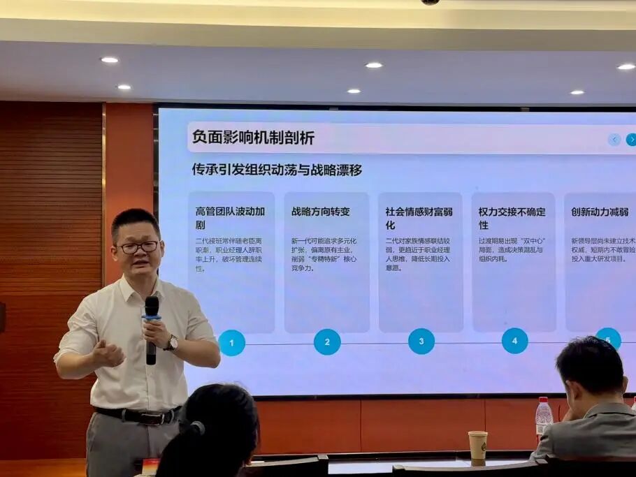 随后,傅颖教授深入剖析专精特新家族企业的成功逻辑,强调其核心竞争力源于家族式治理下的长期主义价值取向与知识传承机制。同时他指出,企业进入代际传承与治理转型阶段后,在战略升级、组织再造及制度完善方面面临现实挑战,“小而美” 迈向 “小而强” 需理念延续与制度革新、专业治理双向赋能。针对发展痛点,傅颖教授提出解决方案:家族企业需引入职业化管理、完善公司治理结构、构建研发创新体系,方能实现从 “技术优势” 到 “创新驱动、治理完善、可持续发展” 的跃迁,为中国式现代化制造体系提供持久支撑。