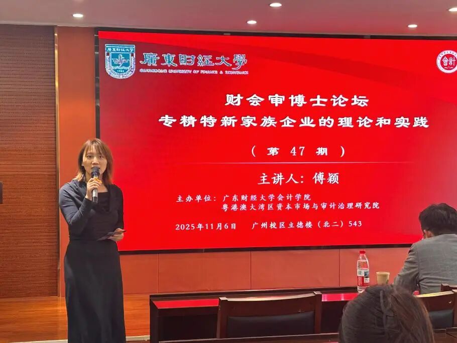 11月6日下午,由会计学院、粤港澳大湾区资本市场与审计治理研究院联合主办的第 47 期财会审博士论坛在立德楼 543 会议室顺利举行。傅颖教授应邀来我院作题为“专精特新家族企业的理论与实践”的专题报告,论坛由会计学院学科建设办公室主任冯晓丽老师主持,杨志强副院长、郑培培和研究生等70余名师生参加。