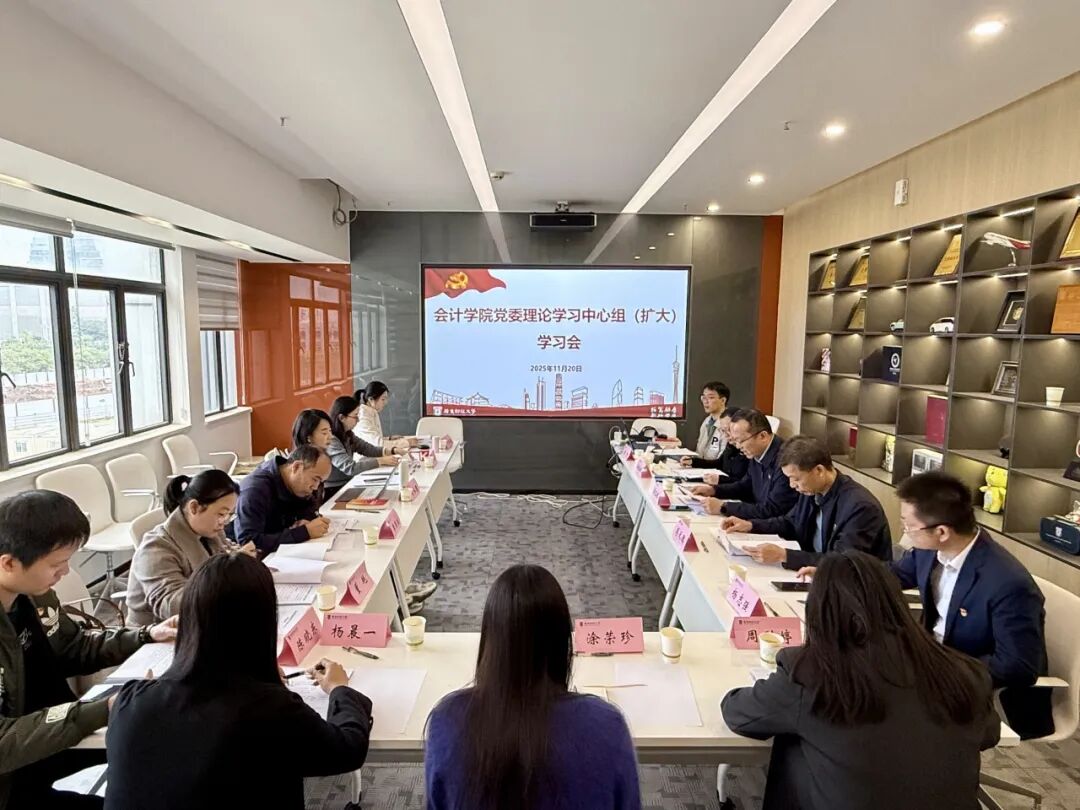 11月20日,会计学院党委在立德楼521会议室召开党委理论学习中心组(扩大)学习会,专题学习《习近平谈治国理政》第五卷和党的二十届四中全会精神。学院领导班子成员、教师党支部书记、学生党支部书记参加会议,学校党建工作督导组督导员李天德到会指导。会议由学院党委书记吴玉强主持。