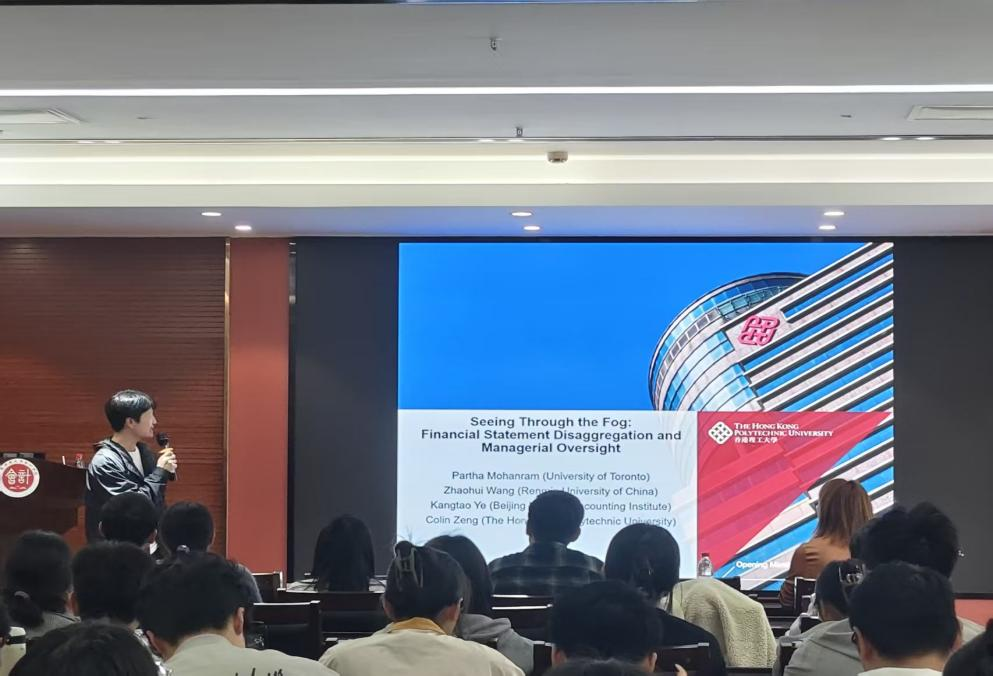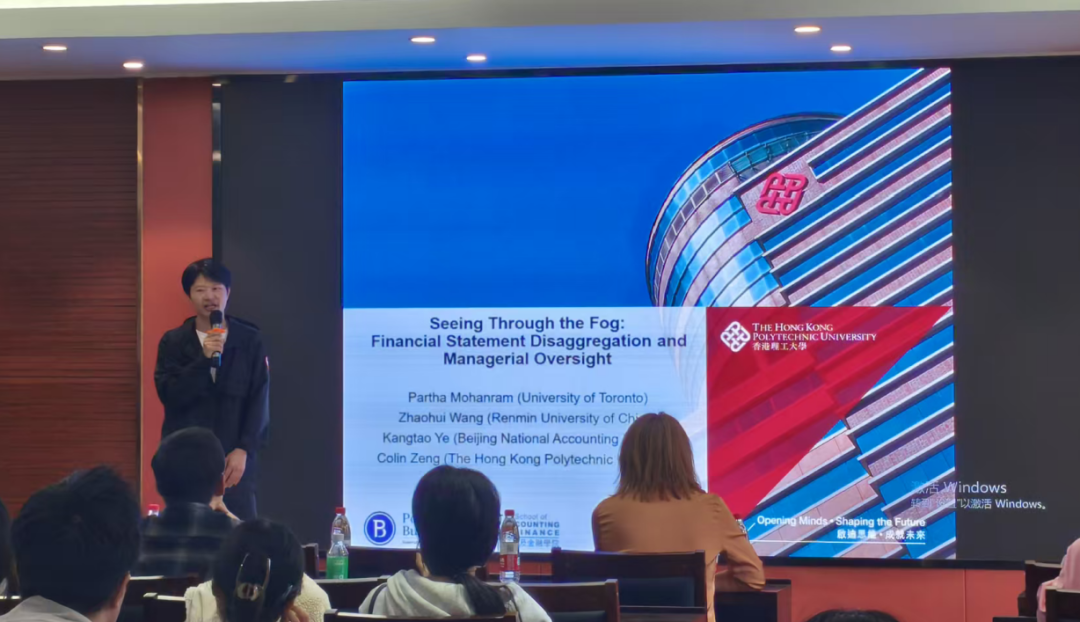 12月23日下午,由广东财经大学会计学院、粤港澳大湾区资本市场与审计治理研究院联合主办的第五十期“财会审博士论坛”在立德楼543会议室顺利举行。香港理工大学商学院曾诚副教授为我院青年教师和研究生作题为“Seeing Through the Fog:Financial Statement Disaggregation and Managerial Oversight”的讲座。论坛由会计学院学科建设办公室主任冯晓丽老师主持,会计学院60余名师生参与本次论坛。