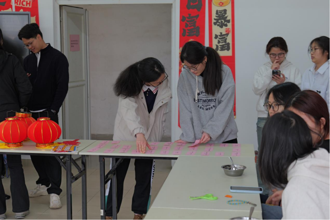 在紫园“一站式”学生社区,灯笼红火,谜条轻扬,一张张灯谜卡片整齐铺开,同学们三五成群围拢过来,或凝神思索,或恍然大悟,清脆的笑声在暖意融融的室内此起彼伏。