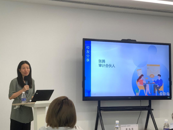 随后进行座谈交流。司农审计合伙人张腾(1997级会计学专业校友)、人力行政总监黄伟萍、人力资源部程潇潇,正保国际教育职业规划师陈秀花、广州研途考研首席规划师邓丽贞等出席座谈会。
