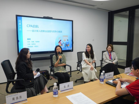 座谈交流后, 张腾、程潇潇、陈秀花、邓丽贞作为嘉宾,开展了圆桌会议。以问答形式,为学生勾勒职业发展蓝图。围绕“AI冲击下的职业定位”“事务所晋升通道”“简历修改润色”等话题进行分享,建议学生“以专业筑基、以技术赋能”,现场互动气氛热烈。