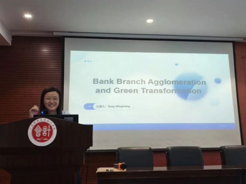 第三个主题是由滕明明老师报告其研究成果《Bank branch agglomeration and corporate green transformation》。随着全球对8环境保护和可持续发展的重视日益增强,以及我国“碳达峰”和“碳中和”目标的提出,企业绿色转型已成为推动经济社会高质量发展的关键路径。在这一背景下,滕老师对银行分支机构集聚对企业绿色转型做出研究,发现银行分支机构作为金融服务的重要载体,通过集聚效应,为企业的绿色转型提供了强有力的金融支持。